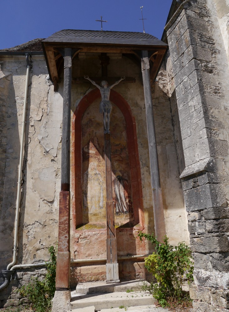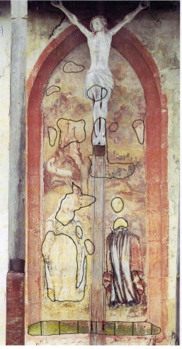 L'ensemble est constitué d'un grand crucifix en bois, et d'une peinture murale, située en arrière-plan, sur la maçonnerie de la baie.