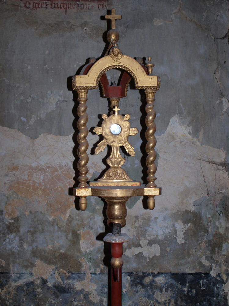 Bâton de procession de confrérie, Saint Sacrement : inscrit à l'inventaire général du patrimoine mobilier, XVIIIe siècle, Menuiserie, en bois taillé peint et doré.