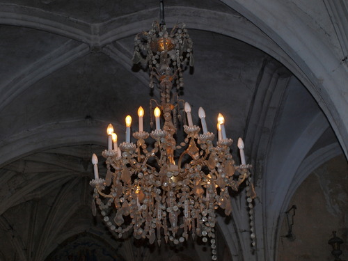Lustres : ils ont été offerts à l'église. L'église fut dotée d'électricité en 1927 et depuis cette installation, tout ce que nous pouvons observer sur ces lustres, vis et fils électriques, sont les mêmes qu'à l'origine.